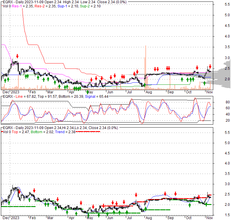 EQRX receives outperform rating in price to book value and discounted cash flow. Technical indicators signal the bullish signs, as there is a bullish crossover in the stochastic oscillator, the MACD is trying to cross backup. The RSI(14) stands at 55.9 with positive bias. We rate EQRx, Inc. (EQRX) a BUY. |